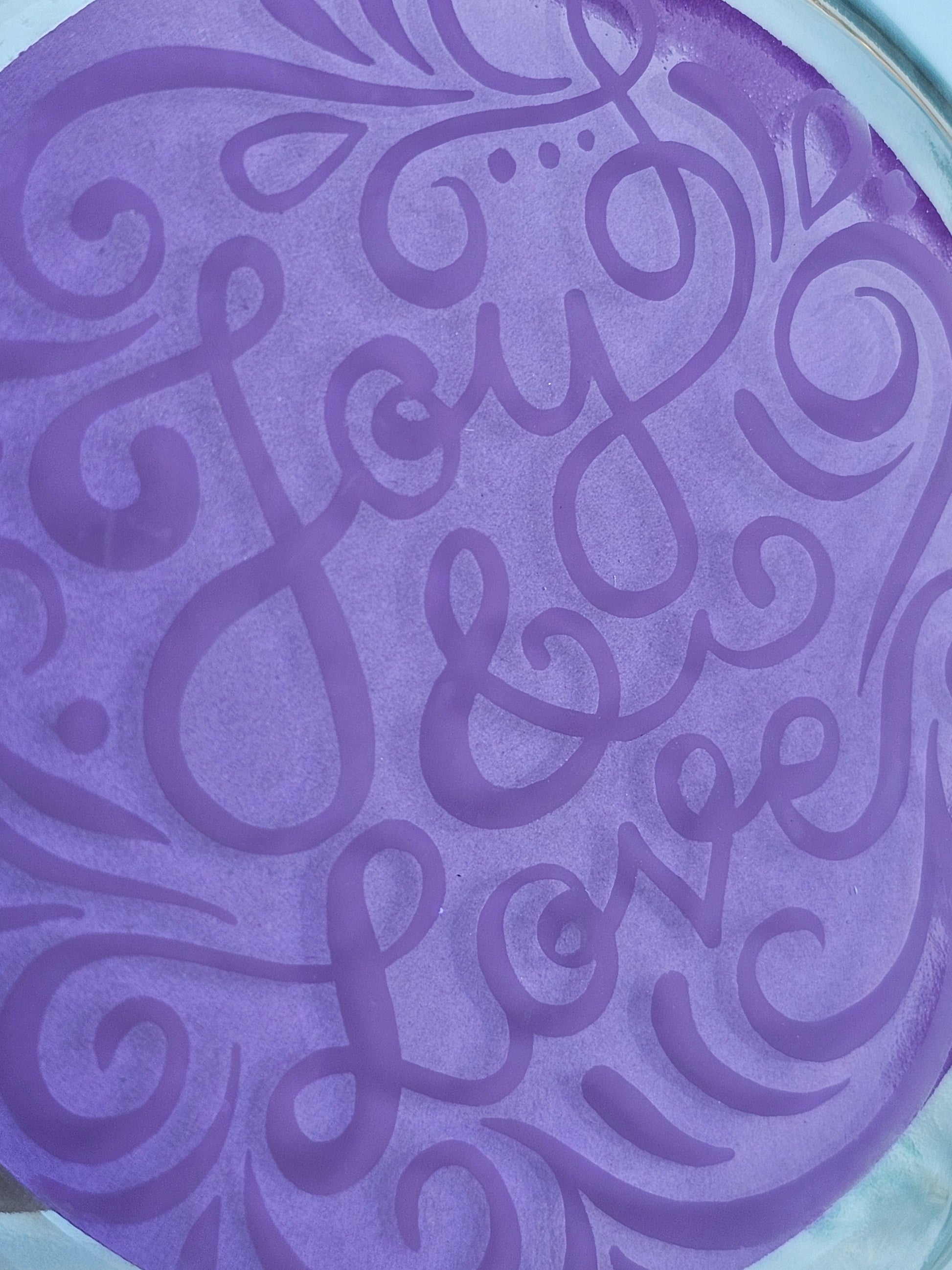This fun candy jar is etched on both sides! Shown is some elaborate inspirational words, but we can do any theme! The colors are just used to show the detail and won't be in the jar.