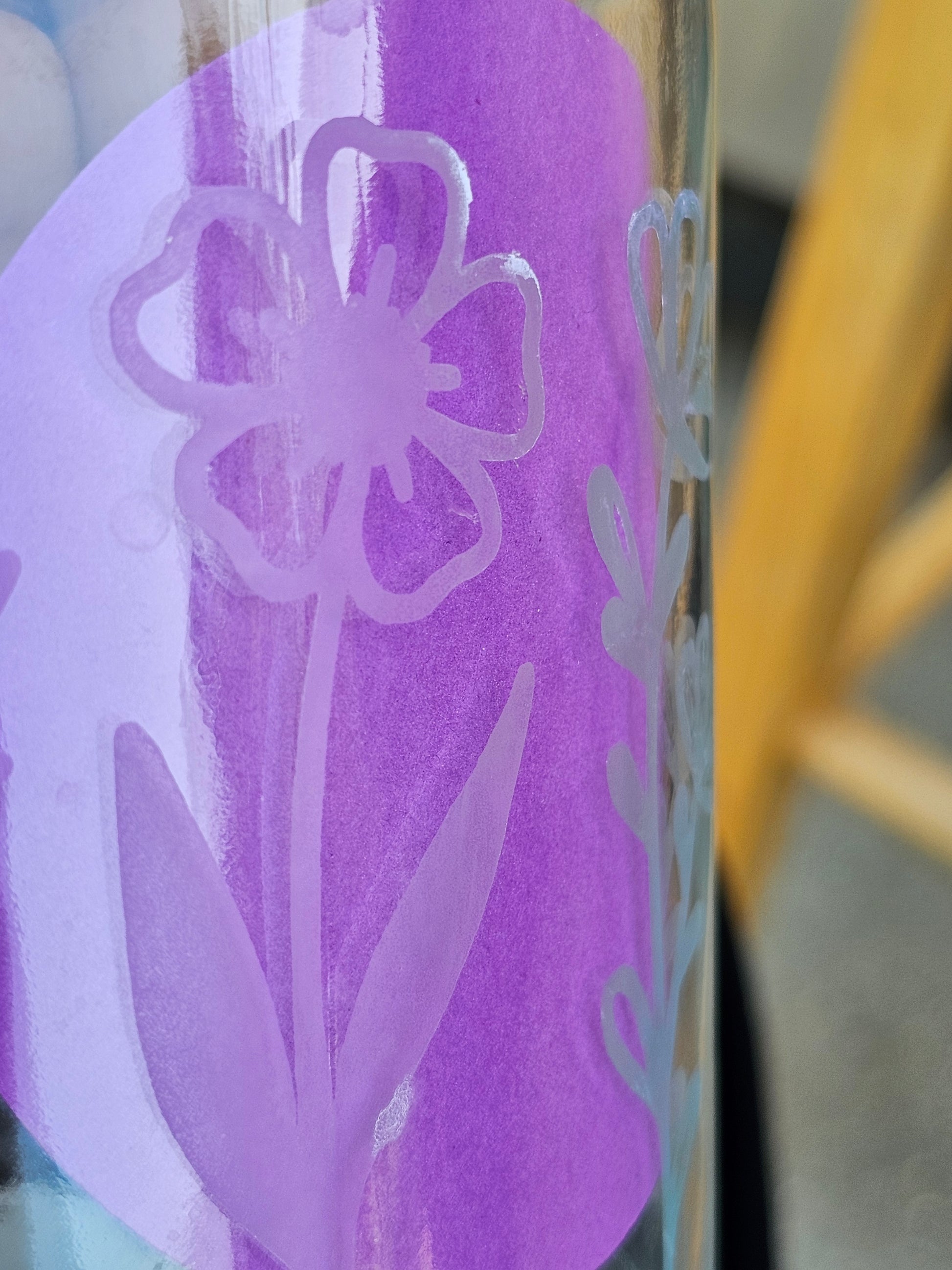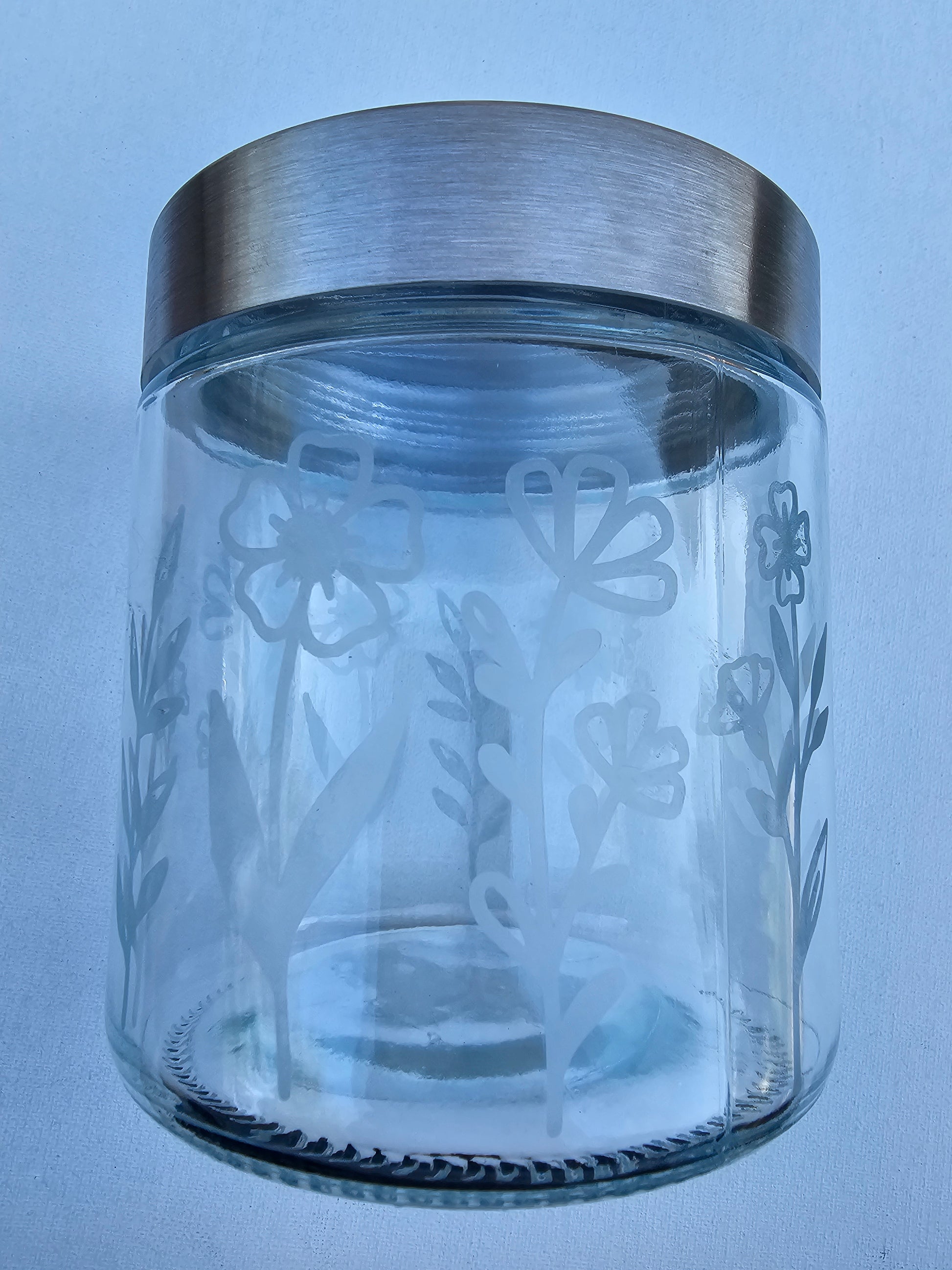 Etched glass is so pretty! This jar has wildflowers all the way around, but other patterns are available upon request.
